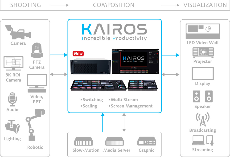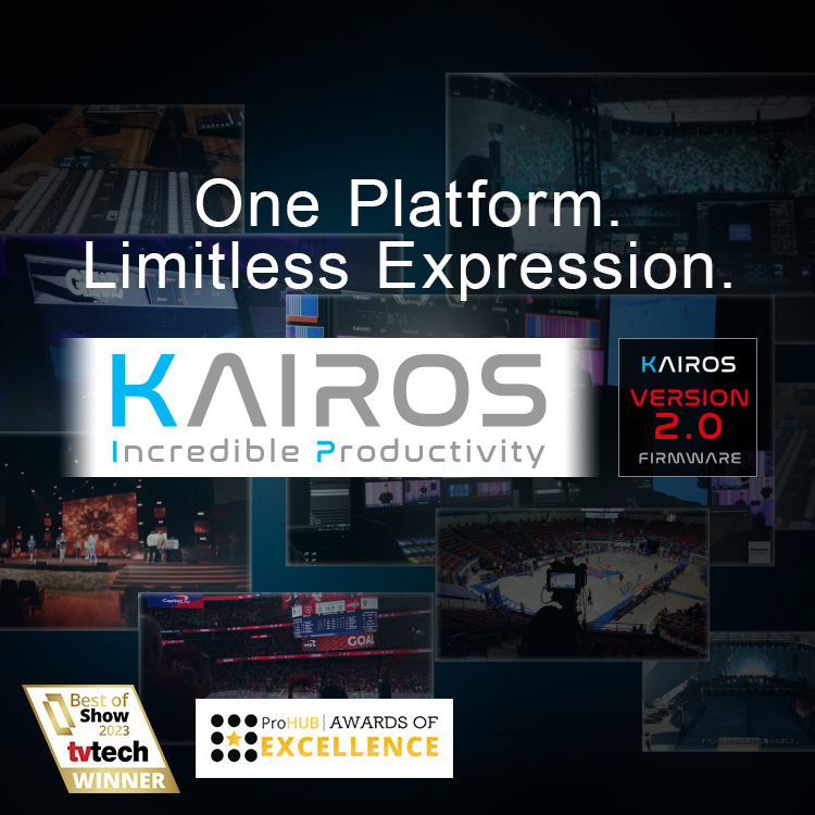 Next gen live platform, IT/IP Platform KAIROS achieve unprecedented innovation for live video. The live video production platform allows flexible system configuration and operation, delivering improved video quality and productivity.