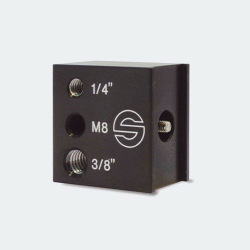 Adapter with 1/4in, M8 and 3/8in tap hole for additional accesories, for mounting on fluid heads with adapter viewfinder extension and adapter block.