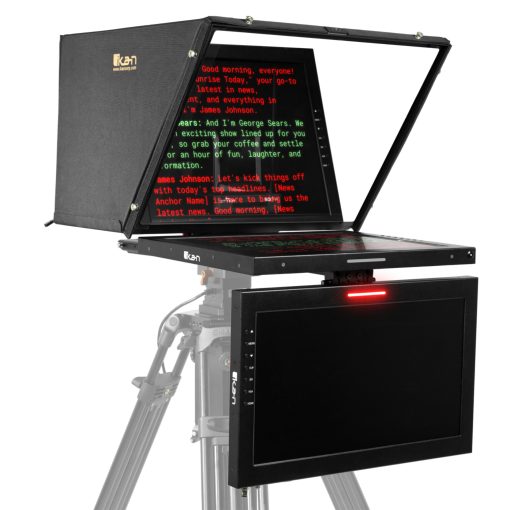 Ikan’s professional teleprompter series is designed for a quick and easy setup to work efficiently in studio or broadcast applications. The included teleprompter hood fully encloses the PTZ camera allowing it to move freely inside the hood. The teleprompter features a 65/35 reflective glass that makes the reflection easier to see for the presenter. The lightweight aluminum teleprompter has multiple 1/4-20” and 3/8-16” threads for mounting to a tripod or pedestal. The monitor includes SDI, HDMI, Composite, and VGA video inputs. Its high bright screen ensures clear visibility in any lighting condition. An intuitive image flip button allows for easy adjustment of the display orientation. The monitor also features a wide viewing angle and a 19” widescreen SDI talent monitor with a built-in tally light.