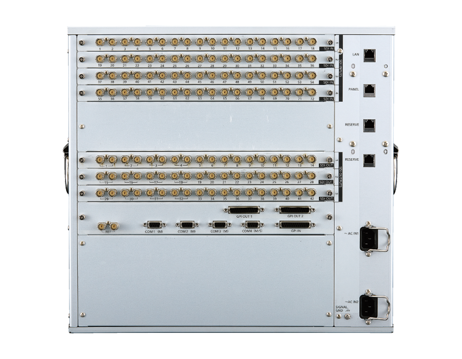 The control and menu panels support accurate switching and intuitive operation and boast a multitude of functional inputs and outputs as well as keyers and DVEs that support a variety of performances. Additionally, 4K video production is supported through 4K format* compatibility.