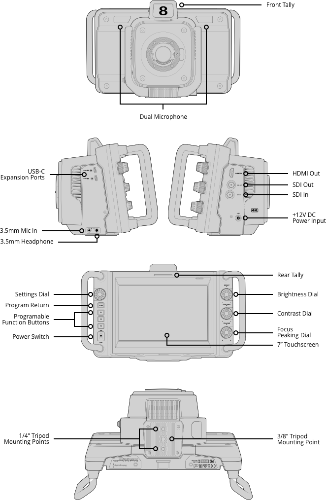 Touchscreen camera settings and menus with rotary settings dial, program button, F1, F2 and F3 assignable function buttons, brightness contrast and peaking dials.