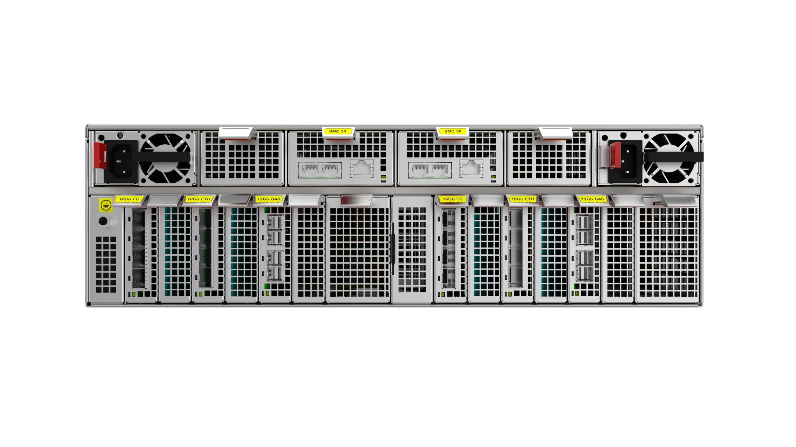 High-performance multi-core processors used for controllers. Up to 768GB DRAM data cache can be configured per controller enclosure. High-density disk drawer within the 3U controller enclosure provides 42-Bays.