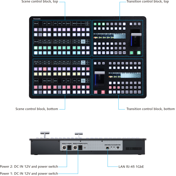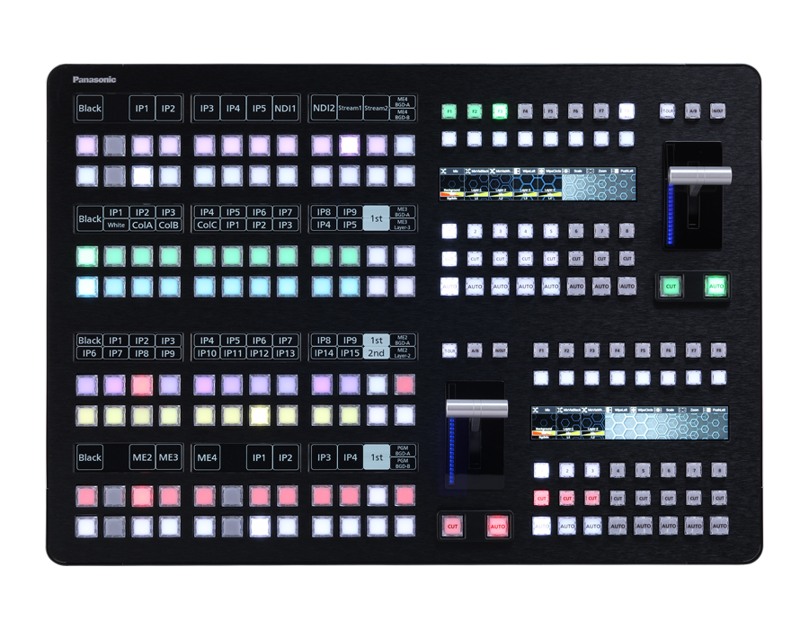 The “Kairos Control” panel is available in two models: 24XPT standard layout (AT-KC10C1) and 12XPT compact layout (AT-KC10C2). The panels allow functions to be assigned freely. Indicators show the functions assigned to individual buttons. Multi-scene operation is supported with two ME layouts and two faders. Multiple panels can be used simultaneously within a single system.