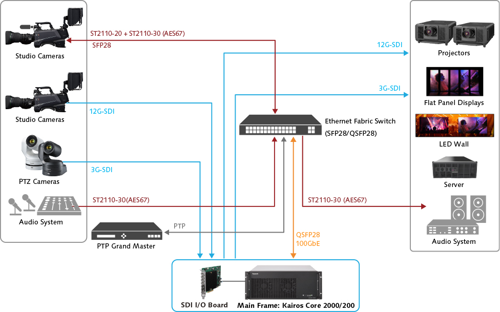 For example, via the ST 2110 network, a single mainframe Kairos Core 2000 can simultaneously connect up to 64 inputs/40 outputs*.