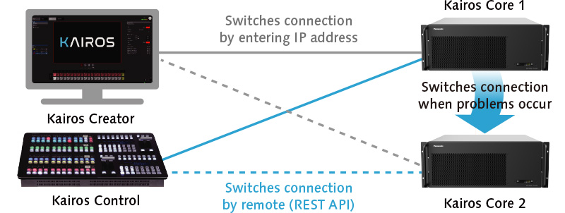 Note: Use REST API in Kairos Control to switch between two Kairos Core mainframes. In Kairos Creator, enter the IP address on the GUI menu for manual switching.