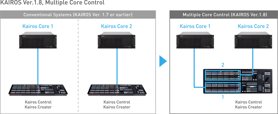 Up to two Kairos Cores can be operated from single Kairos Control Panel or from single Kairos Creator. It is possible to assign buttons on one control panel to both the first and second Kairos Core, so that video and material from two Kairos Cores can be easily operated from a single control panel. In addition, settings for the two Kairos Core can be configured in Kairos Creator, and various settings* such as scenes and transitions can be easily reflected between the two Cores in one GUI.