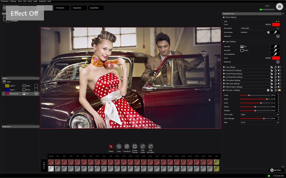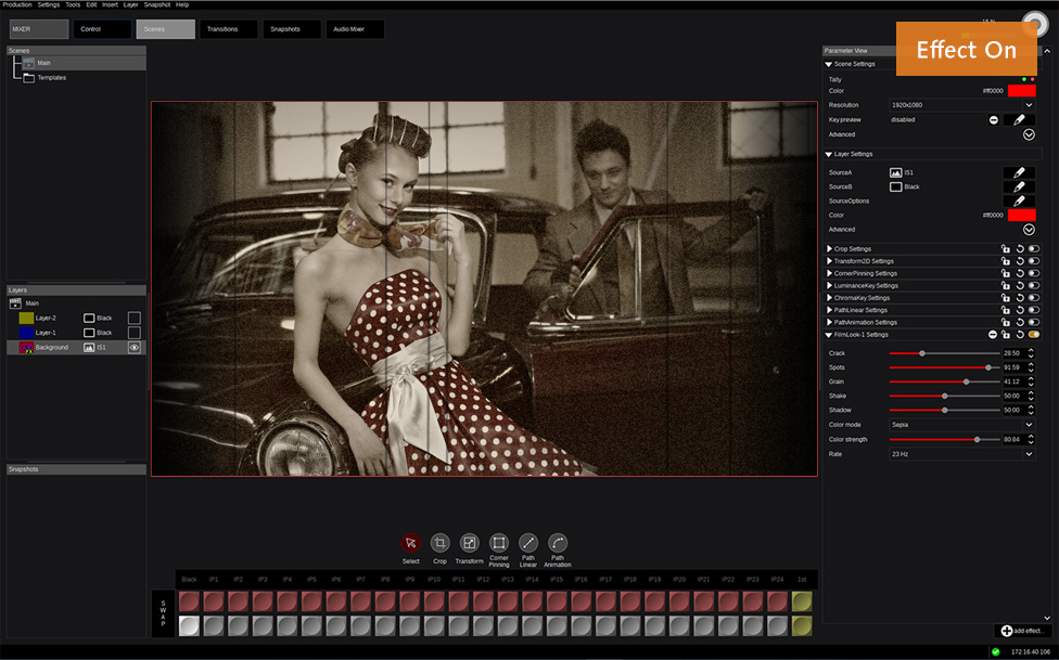 In addition to the aforementioned video inputs and outputs, KAIROS is also equipped with four multiviewer outputs for Kairos Core 2000 (Display Port) that are compatible with 4K/HD. The display layout can be freely customized and saved as your own template, and up to 36 screens images in each screen can be displayed on four screens. This multi-viewer can also manage to display RAM/Clip Player and scene & AUX output. The audio level meter can also be displayed.