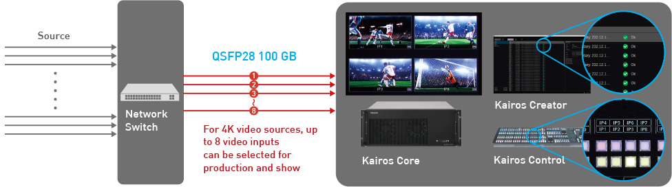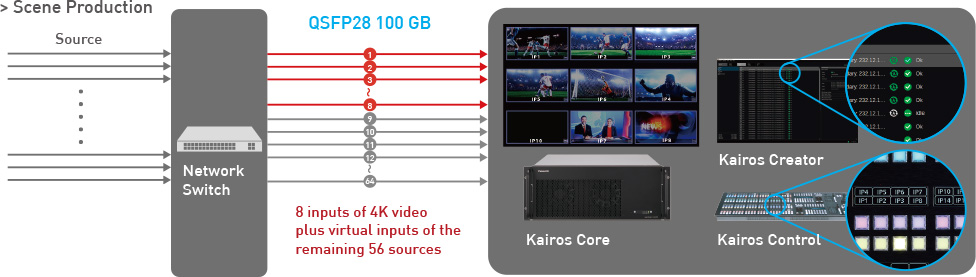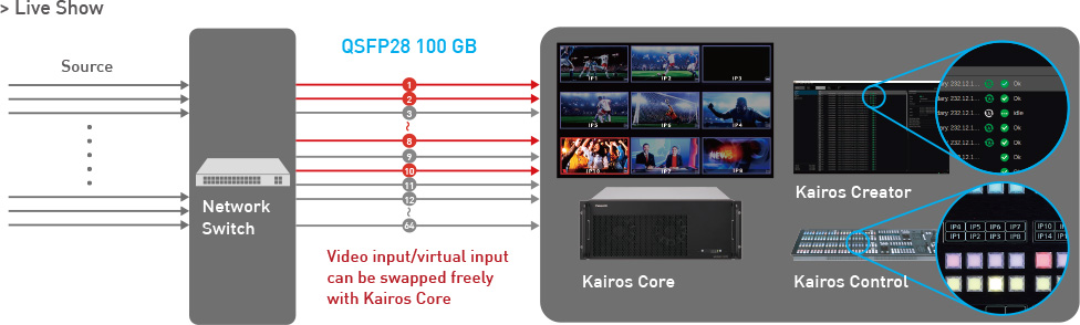 KAIROS removes input restriction to be connected to a system and realize more efficient use of ST 2110 network and other inputs such as SDI, NDI® High Bandwidth, SRT and other streaming inputs.
