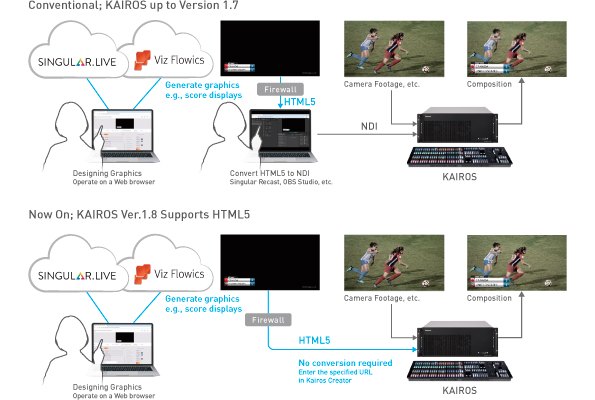 HTML5 graphics are now supported*, allowing scores and other graphics to be input into KAIROS directly without converting files or to manipulate the web from KAIROS using the web browser/page as a video source without modification. Direct input from Singular live and Viz Flowics into KAIROS is now possible, making it possible to create more diverse performances in real-time.