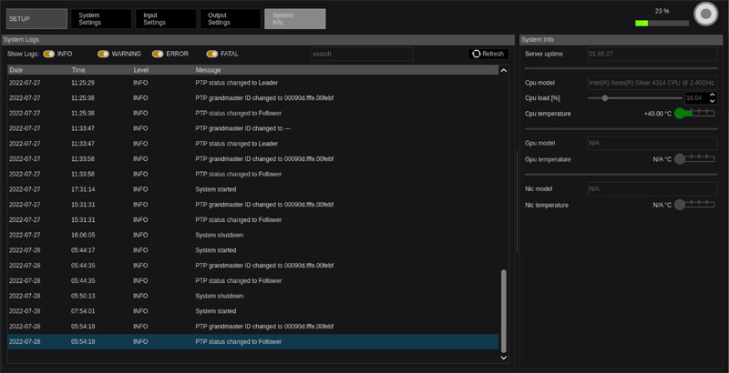 , Multiviewer, GPU Load, Local Time zone, Licence Options, PTP, Genlock, Memory / HDD space, NIC Link Status*