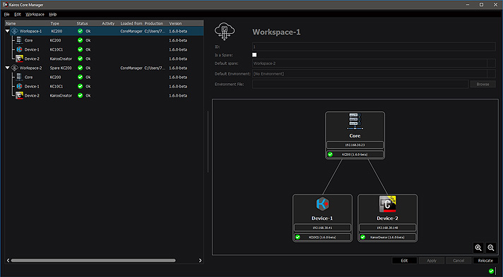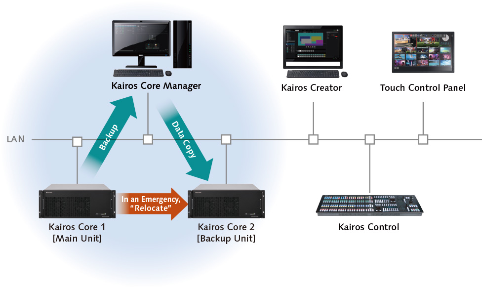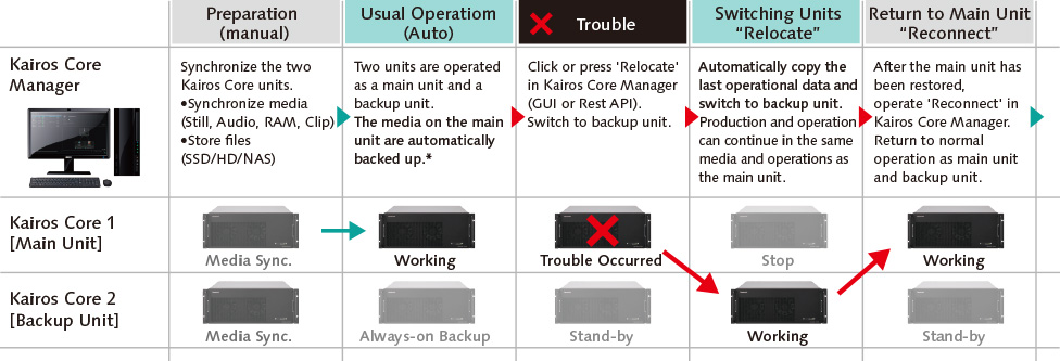 Kairos Core Manager can be used to relocate file data and synchronize media files, so that if the main Kairos Core is down, operations can be switched to the backup Kairos Core and continue.