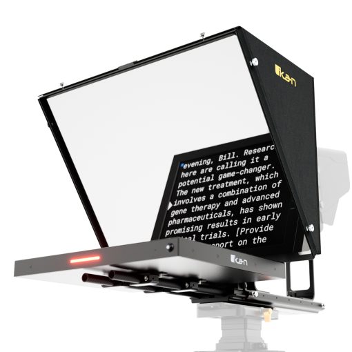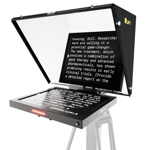 Ikan’s professional teleprompter series is designed for a quick and easy setup to work efficiently in studio or broadcast applications. The teleprompter includes a 65/35 reflective glass that makes the reflection easier to see for the presenter. The lightweight aluminum teleprompter has multiple 1/4-20” and 3/8-16” threads for mounting to a tripod or pedestal. The monitor includes SDI, HDMI, Composite and VGA video inputs. Its high bright screen ensures clear visibility in any lighting condition. An intuitive image flip button allows for easy adjustment of the display orientation. The monitor also features a wide viewing angle, as well as integrated tally lights to let you know when your camera is live. This teleprompter kit includes a durable hard case w/ wheels and custom cut foam. It also features a 15”widescreen SDI talent monitor with a built-in tally light.