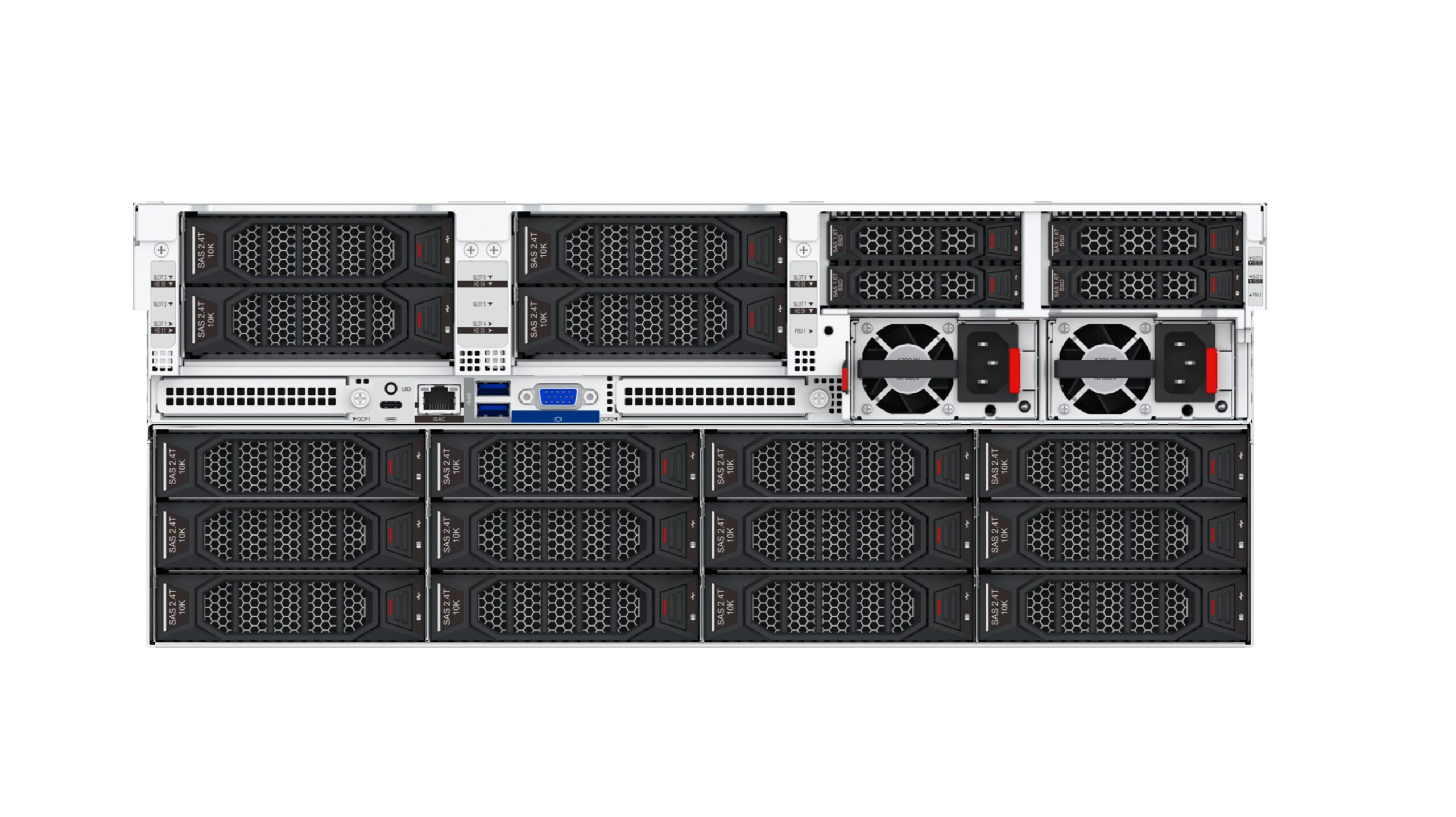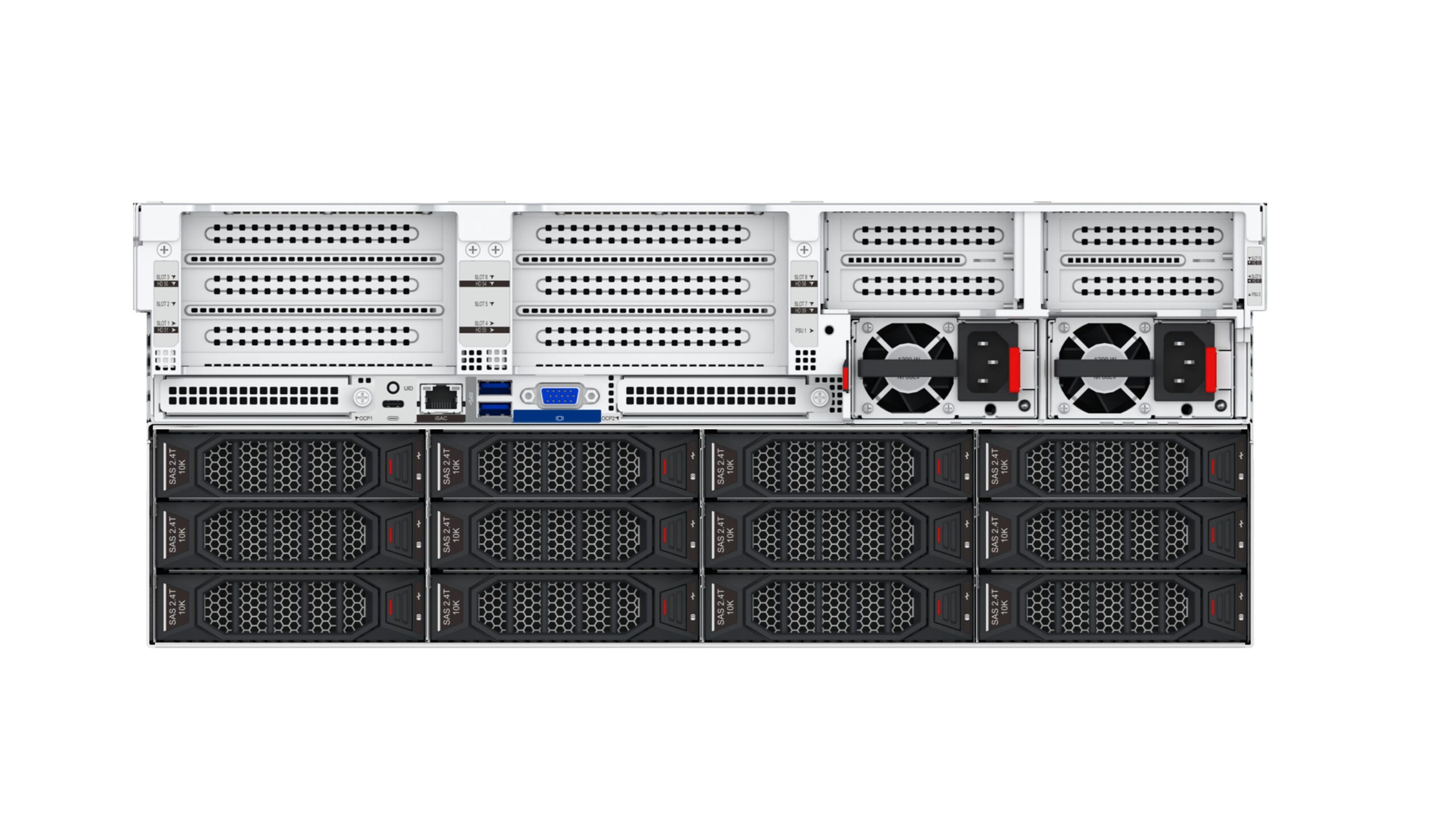 24×2.5/3.5″ drive bays, supporting HDD/SSD, with 8 slots supporting U.2 drives.
