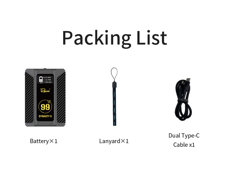 Product Features ●The Rolux DYNASTY II 99Wh V Mount Battery is a versatile and high-capacity power source designed for professional video and photography equipment. It offers the following features: