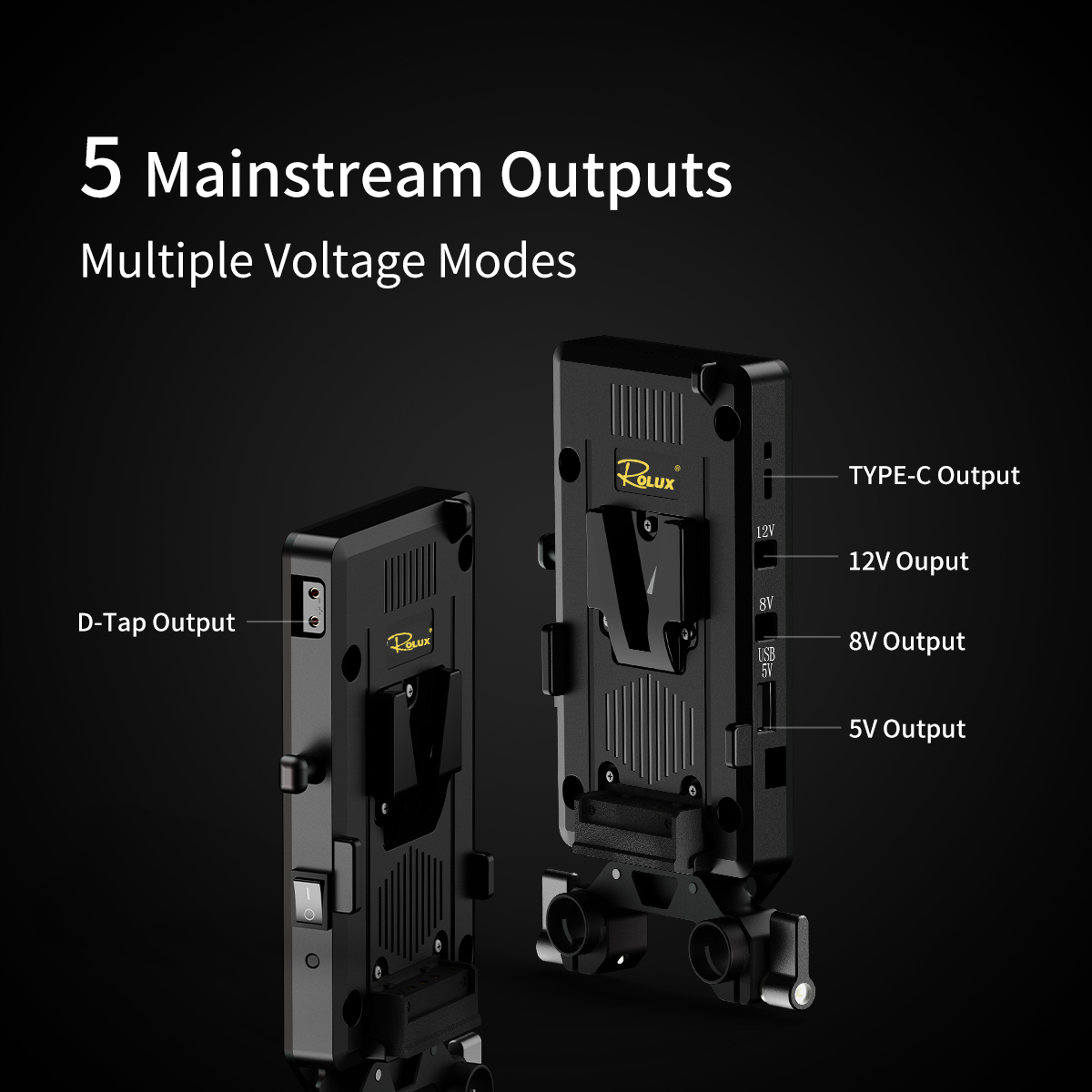 Rolux RL-VP1 V Mount Plate With Multi-outputs USB-C,7.2V, 12V and 14,8V, 15mm base adapter included