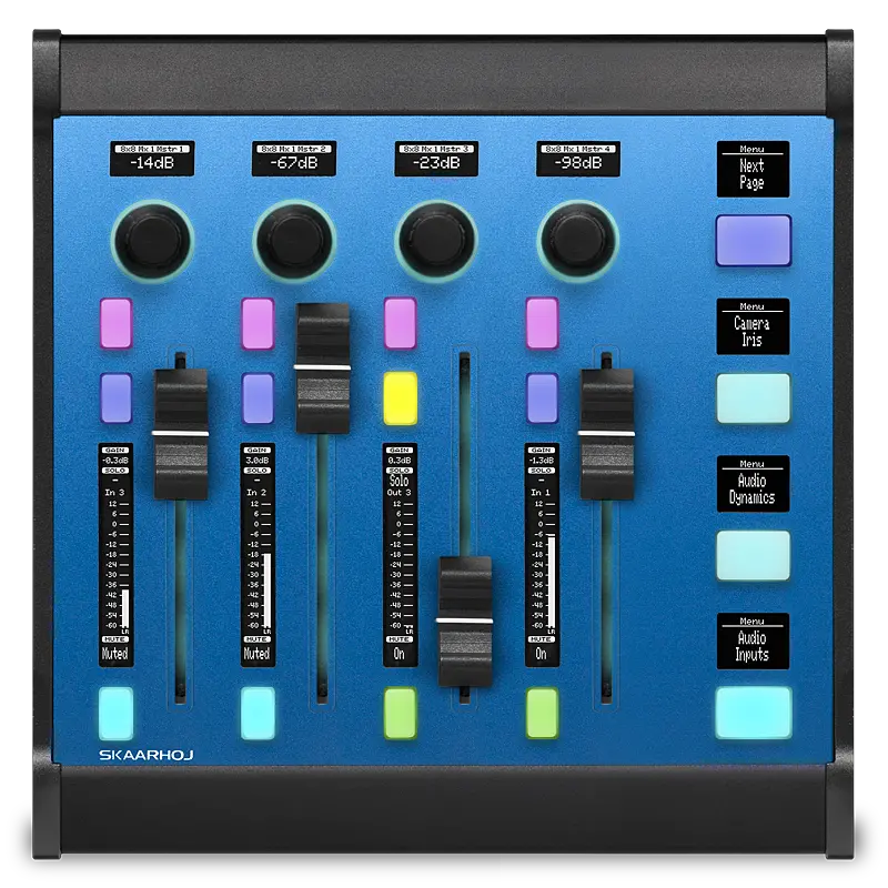 Networked fader bank to control audio processors, audio mixers, DSPs, audio software, and any other application that requires tactile faders, such as lighting control or camera shading. Features four unique SKAARHOJ channel strips, each with an OLED level meter display, motorised fader, encoder, and dedicated 2-way buttons, along with four 4-way buttons to toggle through layers or menus, or to fire snapshots, offering unparalleled user flexibility.